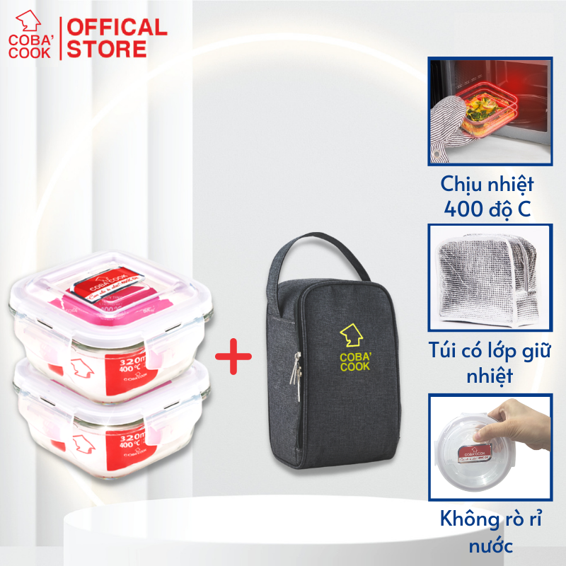 Bộ hộp cơm thủy tinh chịu nhiệt COBACOOK gồm 2 hộp vuông 320ml và túi giữ nhiệt