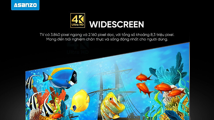 Màn hình của Asanzo 55AG800K được cấu thành từ 8,3 triệu điểm ảnh khác nhau, cao gấp 4 lần so với các loại tivi có độ phân giải FullHD thông thường, giúp hình ảnh được hiển thị rõ nét và sống động như thật.