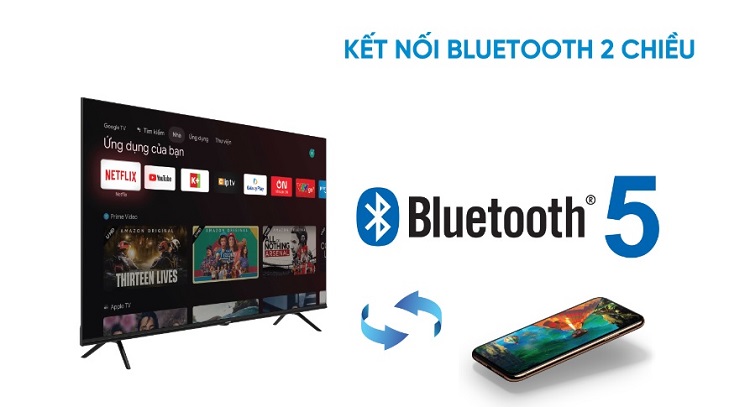 TV được tích hợp Bluetooth 5.0 kết nối 2 chiều, có thể phát âm thanh từ TV ra loa hoặc biến chiếc TV của bạn thành chiếc loa để phát nhạc từ Smartphone hoặc máy tính, ngay cả khi đã tắt màn hình TV.