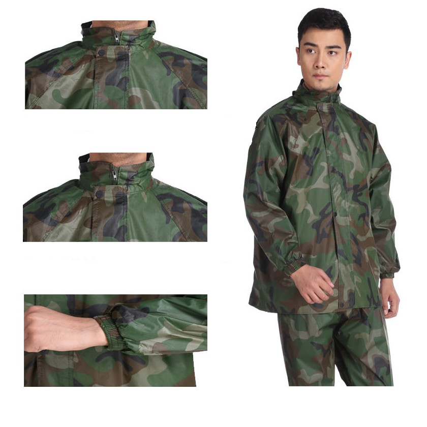 - Bộ gồm: Áo (khóa kéo và nút bóp), quần, nón (có thể tháo rời).