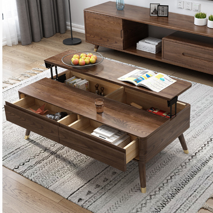 - Mặt bàn sofa gỗ tự nhiên nâng hạ lên xuống và có thêm 2 ngăn kéo cùng hộc tủ để đồ, sách báo, phụ kiện,