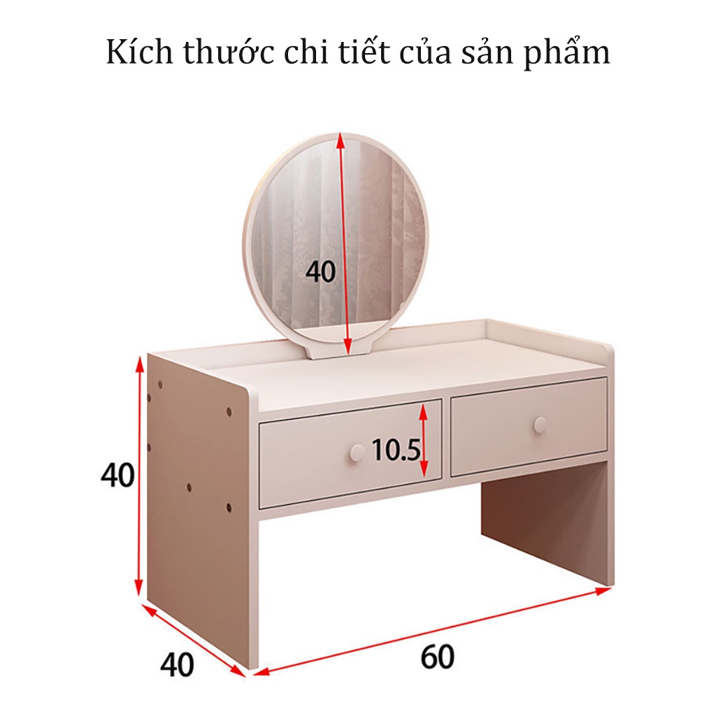 - Kích thước bàn: 60x40x76 cm - Kích thước gương: Phi 40cm, có cảm ứng đèn LED