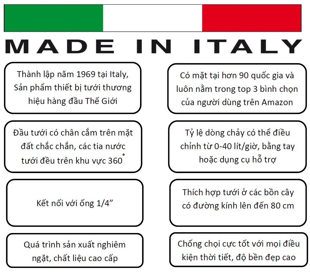 Trải qua quá trình sản xuất nghiêm ngặt và việc sử dụng chất liệu cao cấp, Đầu tưới chân cắm 8 tia là sản phẩm có chất lượng tuyệt vời, sử dụng bền lâu. Sản phẩm có khả năng chống chọi với điều kiện thời tiết khắc nghiệt. luôn giữ được độ bền đẹp và độ nhanh nhạy, chính xác.