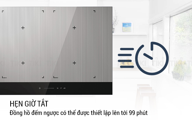 Đồng hồ đếm ngược có thể được thiết lập lên tới 99 phút. Nếu bạn có kinh nghiệm và biết rõ thời gian nấu tối ưu cho một món ăn cụ thể, bạn có thể hẹn giờ nấu, bếp sẽ tự động tắt và phát âm báo sau khi thời gian chạy hết.