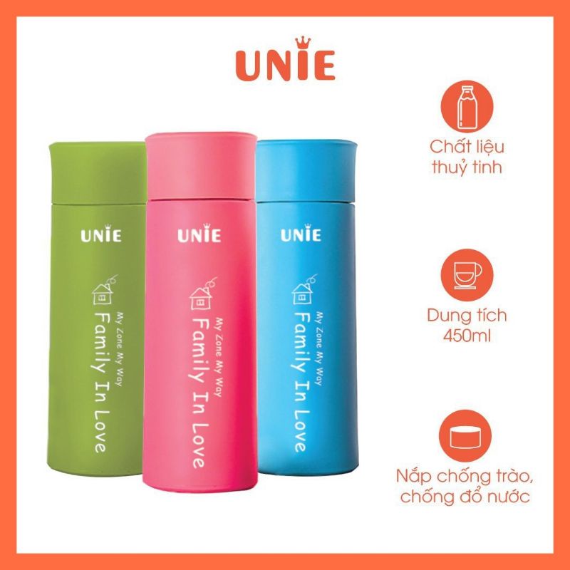 Giới thiệu Bình đựng nước giữ nhiệt Unie UN100, bình thủy tinh bọc nhựa, dung tích 450ml - An toàn