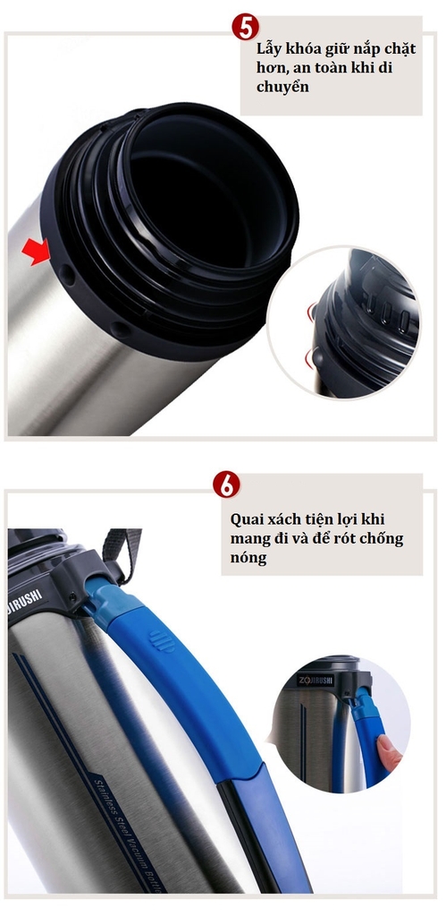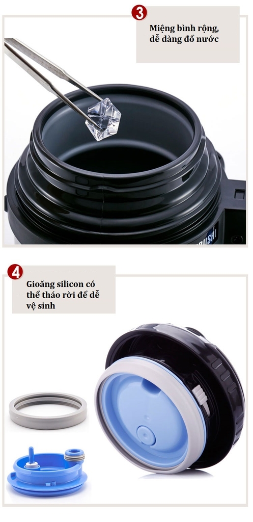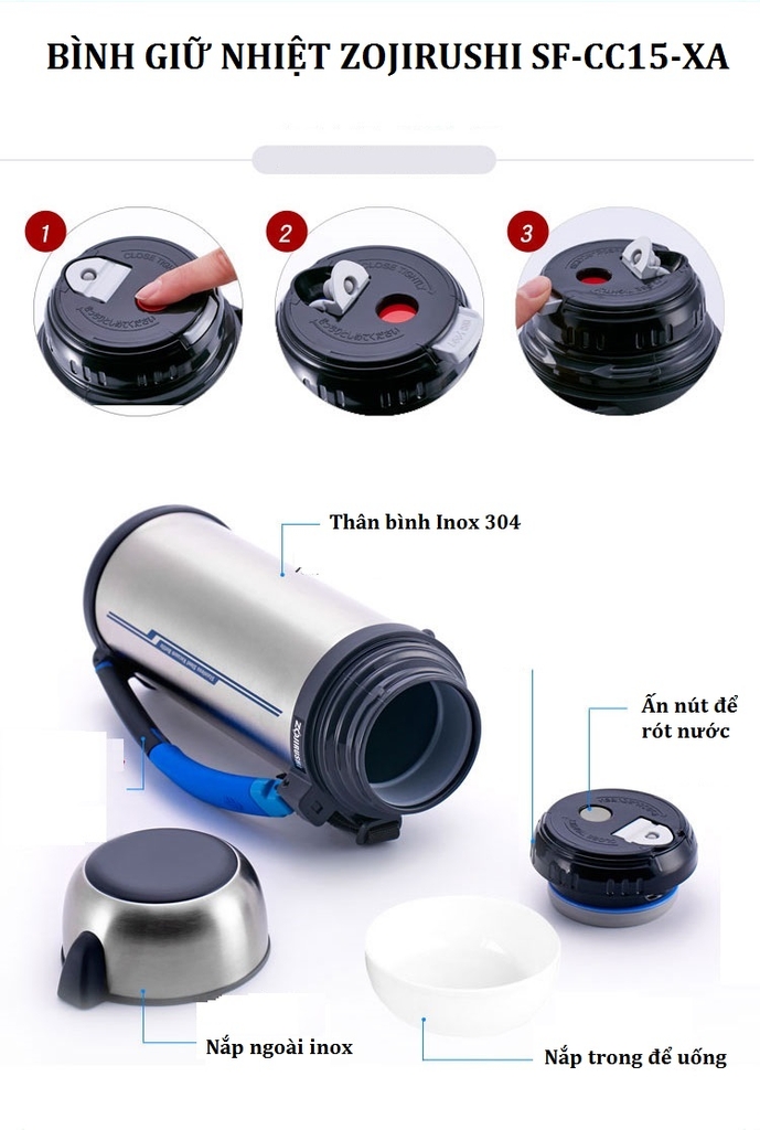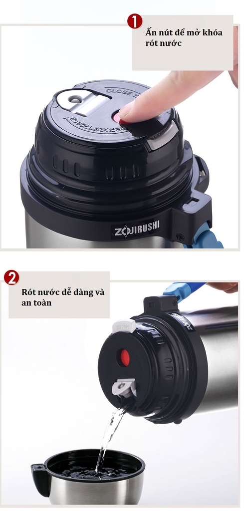 Bình giữ nhiệt có nắp đậy với thiết kế rời có thể được sử dụng như ly uống nước đầy tiện dụng. Kích cỡ miệng rộng cho phép bạn dễ dàng bỏ đá vào khi bạn có nhu cầu uống lạnh. Bên trong là nút bấm để rót nước vừa mang tính vệ sinh cao vừa an toàn cho bạn khi cần rót nước nóng.