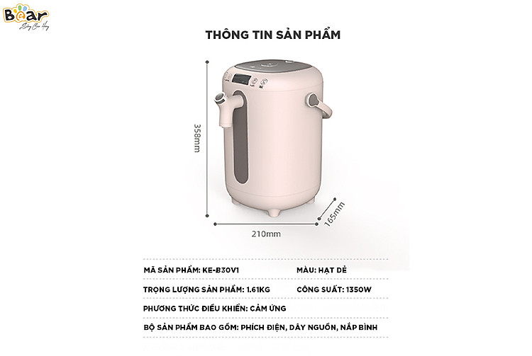Bình thủy điện Bear KE-B30V1 với dung tích 3 lít cùng thiết kế thông minh với 11 mức nhiệt độ giữ ấm nước khác nhau vô cùng tiện lợi, phù hợp với mọi gia đình. Đặc biệt KE-B30V1 còn được tích hợp tính năng khử Clo và khóa trẻ em an toàn hơn khi sử dụng. Cùng Bear Việt Nam trải nghiệm ngay nhé.