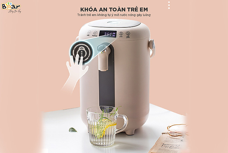 Điểm độc đáo của bình thủy điện Bear chính là tích hợp khóa an toàn cho trẻ em thông minh, để khởi động tính năng chỉ cần ấn nút khóa an toàn trên thân bình, khi tính năng này khởi động vòi sẽ tự động khóa không cho lấy nước.