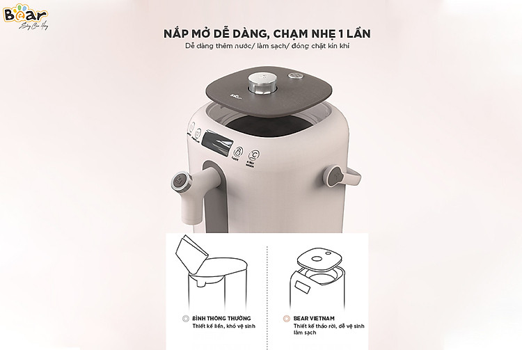 Nắp bình thiết kế độc đáo, khác biệt hoàn toàn với các dòng khác trên thị trường, ấn nhẹ để và nhấc nắp bình lên. Xung quanh nắp bình được đệm silicon cao cấp đảm bảo không bị thoát nhiệt trong quá trình đun và giữ ấm. Miệng bình rộng, dễ dàng thêm nước và làm sạch trong quá trình sử dụng nhé.