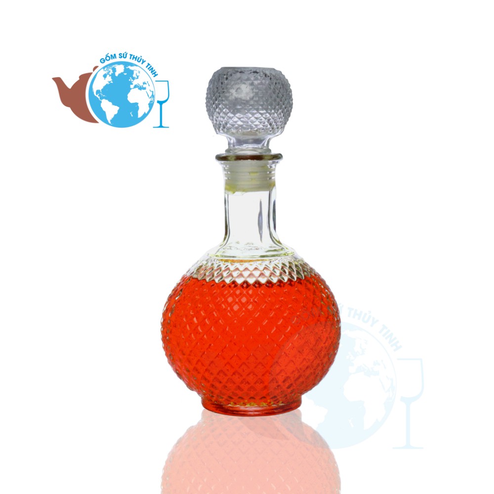 * Bình thủy tinh có độ dày, kiểu dáng hình tháp, phần đáy phình bầu tròn to họa tiết hình vuông lập thể, phần thân tròn nhỏ, nắp bình thủy tinh họa tiết kim cương lập thể, thiết kế kiểu dáng cao cấp tạo hình cao quý sang trọng, thủy tinh trong suốt, nổi bật được bình đựng rượu ngâm bên trong.