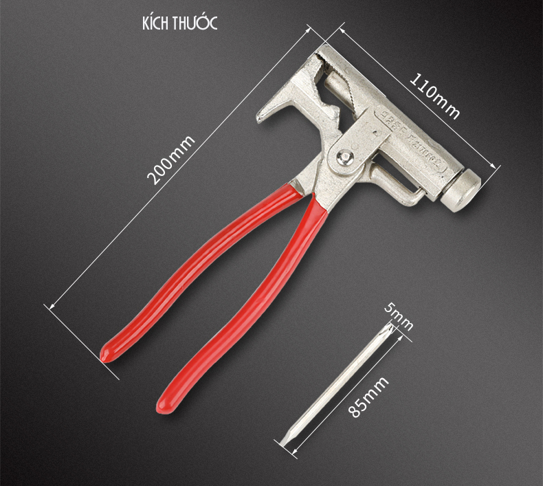 | Hướng dẫn sử dụng | Lắp đinh vào Dụng cụ đóng đinh đa năng siêu bền, chốt chắc chắnKê đầu dụng cụ tại vị trí cần đóng đinh, dùng búa đóng vào phần chốt tròn trên đầu dụng cụNgoài ra kìm giữ đinh và đóng đinh ra có nhiều chức năng khác kèm theo như:Làm búa đóngLàm kìm thông thườngLàm kìm mở bu lôngLàm dụng cụ nhổ đinhLàm dụng cụ cắt dây kẽmLàm dụng cụ tô vítLàm cờ lêLàm kìm kẹp đồ vật |