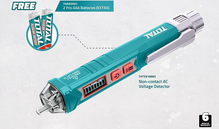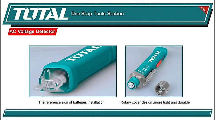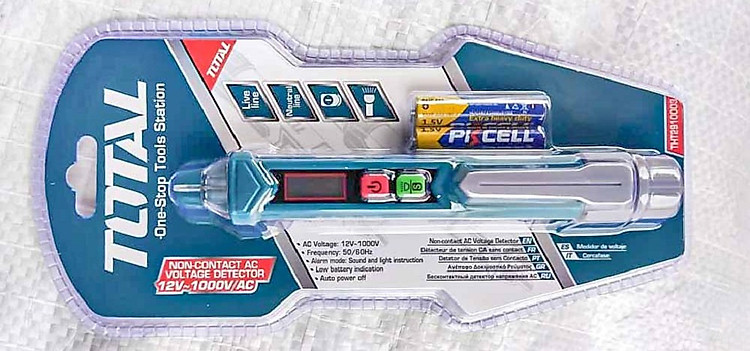 Bút dò điện áp cảm ứng AC 1000V TOTAL THT2910003 đo được điện áp xoay chiều AC lên đến 1000V, có chế độ báo động âm thanh và ánh sáng, Tự động phân biệt đường dây nguội và đường dây nóng và sản phẩm có kèm sẵn pin