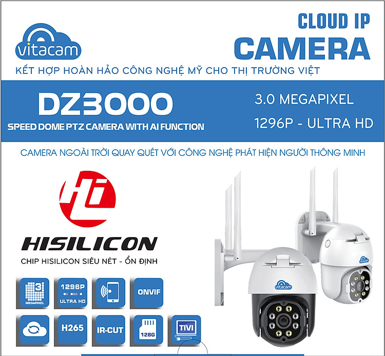 CAMERA NGOÀI TRỜI VITACAM DZ3000 PTZ XOAY 355 ĐỘ, 3.0 MPX 1296P HÌNH ẢNH ULTRA HD SIÊU NÉT