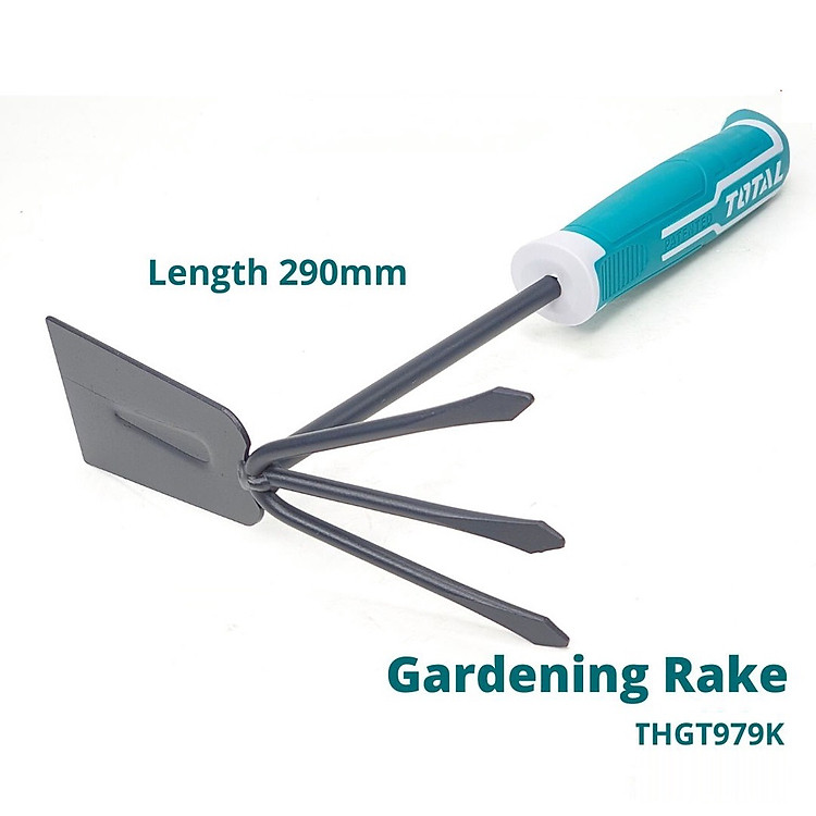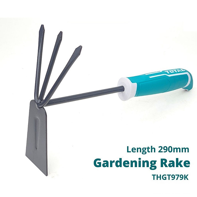 - Cây cào đất làm vườn 2 đầu 290mm TOTAL THGT979K có chiều dài 290mm, là kích thước lý tưởng để bạn tiếp cận các khu vực hẹp và khó tiếp cận trong vườn. Kích thước này cũng giúp tạo ra lực cào đất tốt và tiết kiệm sức lực.