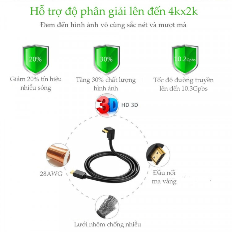Cáp HDMI to HDMI HD103 bẻ xuống góc vuông 90 độ Ugreen . Cáp cấu tạo bằng nhựa cao cấp cho độ bền lâu và sản phẩm cho độ truyền tải tín hiệu nhanh nhất , hình ảnh sắc nét nhất.