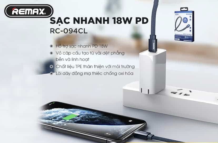 Dây cáp được làm từ TPE mềm dẻo và linh hoạt, bề ngoài được bỏ vải dệt nên rất bền và chắc chắn. Cáp sạc bọc vải RC-094CL chắc chắn sẽ là phụ kiện bền bỉ nhất dành cho bạn khi ghé thăm Remax.