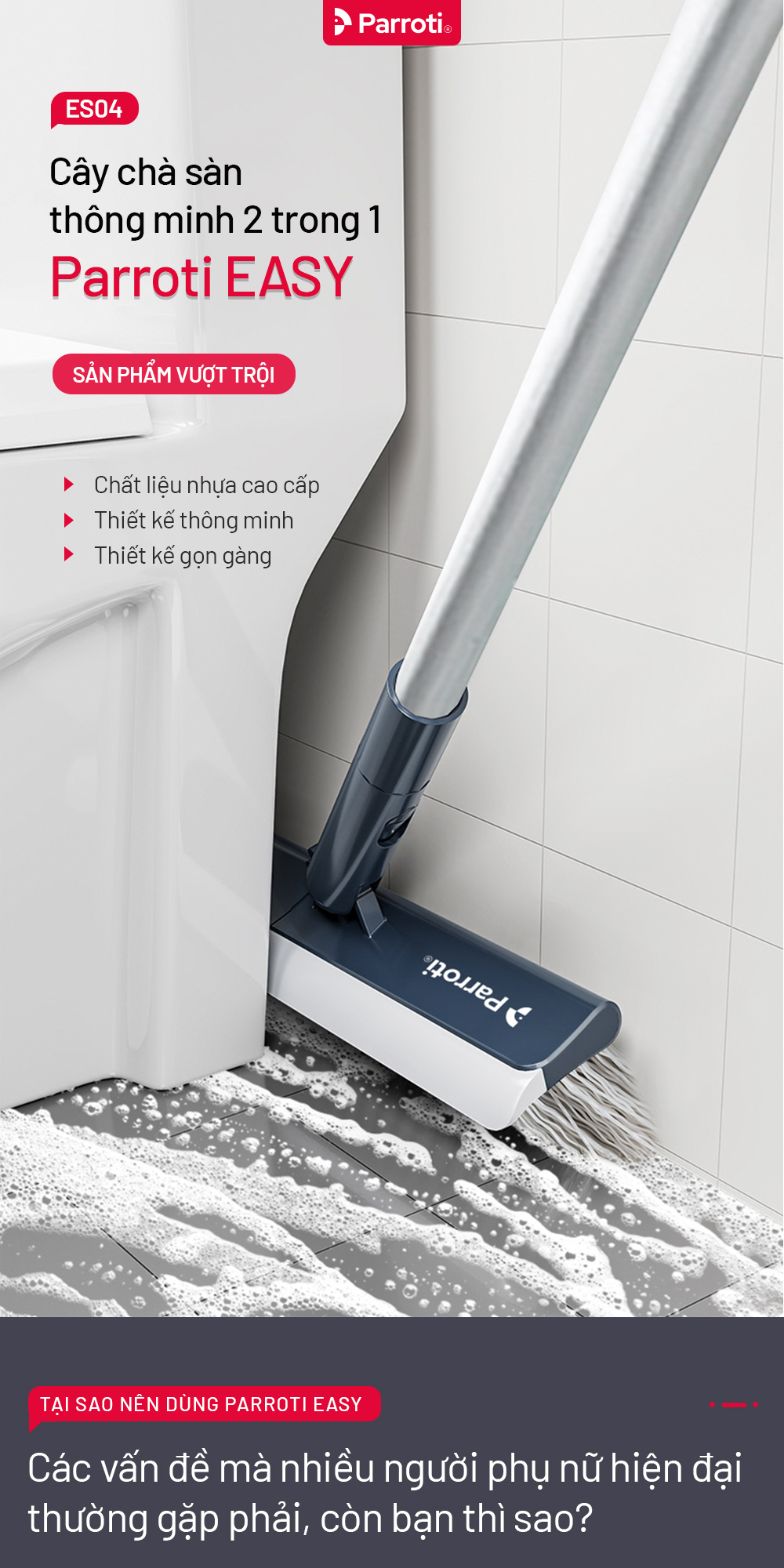 Chổi cọ sàn vệ sinh Parroti Easy ES04 được thiết kế thông minh, đầu cọ cực kỳ linh hoạt giúp cọ sạch các vị trí khe hẹp hoặc góc tường một cách dễ dàng, cây chổi làm bằng nhôm chống rỉ cao cấp, có độ dài phù hợp chống cúi người gây đau lưng. Cộng với tính năng vừa chà vừa gạt nước thông minh sẽ giúp bạn làm vệ sinh một cách nhanh, sạch và dễ dàng hơn.