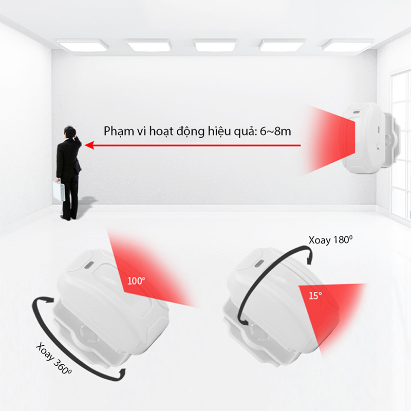 - Chuông báo khách không dây với bộ phát độc lập với chuông, bộ phát trang bị cảm ứng chuyển động nên chỉ cần có người trong vùng cảm biến của bộ phát thì chuông sẽ kêu, âm báo lên đến 113dB. Có thể dùng nhiều bộ phát ở các vị trí khác nhau với 1 chuông hoặc nhiều chuông với 1 bộ phát, chỉ cần cho học lệnh