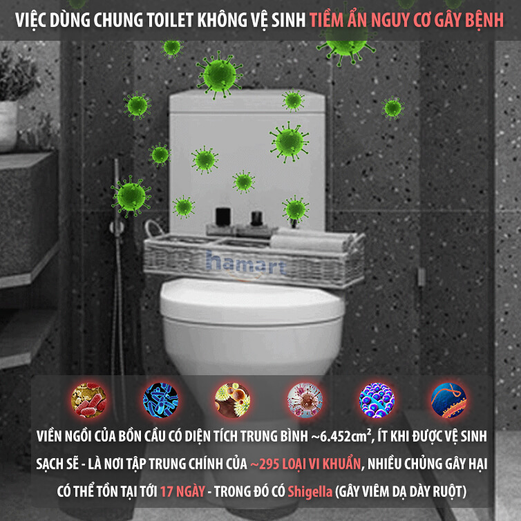 Viền bồn cầu có diện tích trung bình ~6452 cm², ít khi được vệ sinh sạch sẽ, là nơi tập trung chính của ~295 loại vi khuẩn trong đó có nhiều chủng gây hại có thể tồn tại tới 17 ngày tại đây !