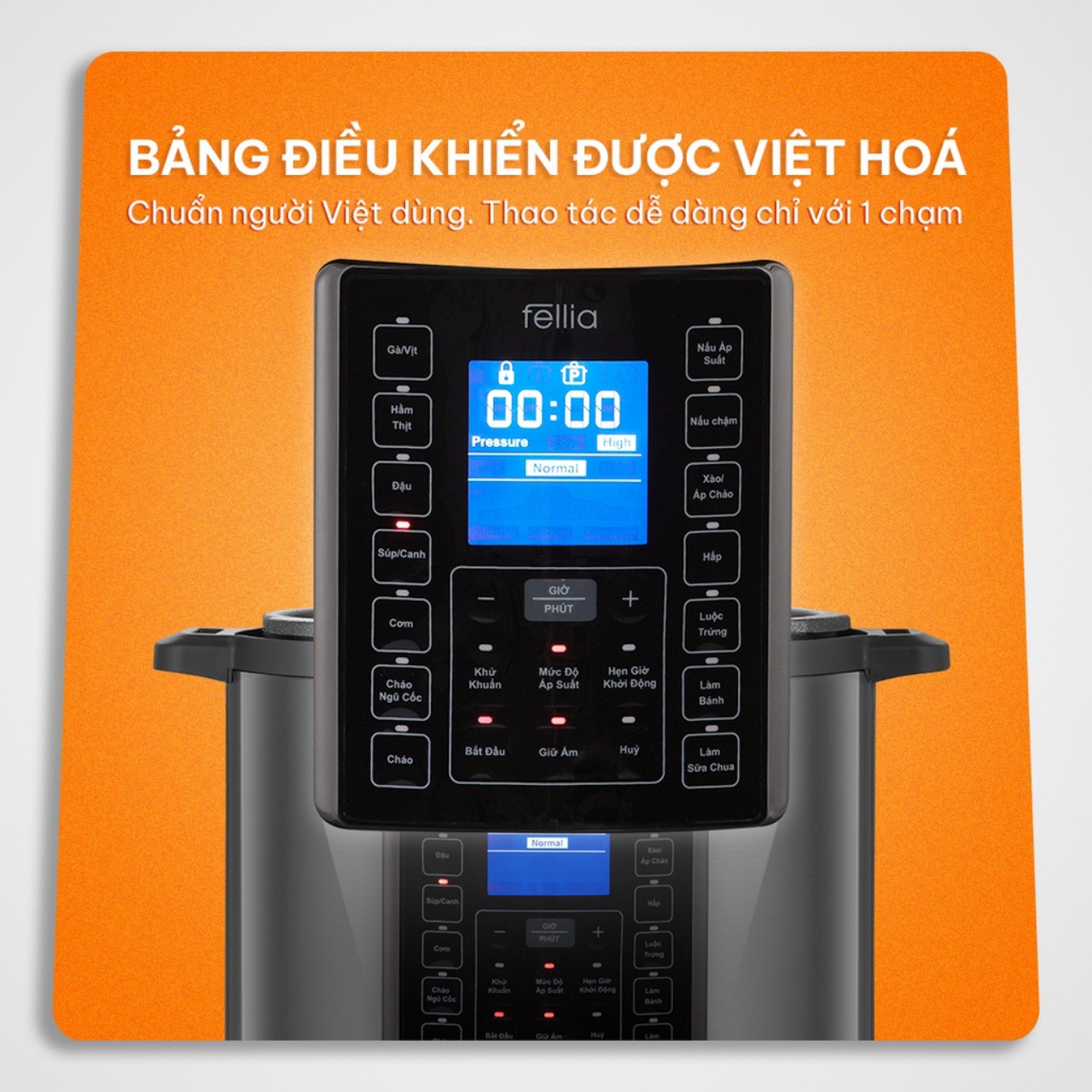 Nồi áp suất điện đa năng Fellia P208 có dung tích 6 lít, với 14 chức năng nấu đa dạng đã được Việt hoá, bên cạnh đó là công nghệ SmartValve tự động xả van, an toàn cho người dùng và kèm theo đó là lòng nồi chống dính, dễ dàng vệ sinh.