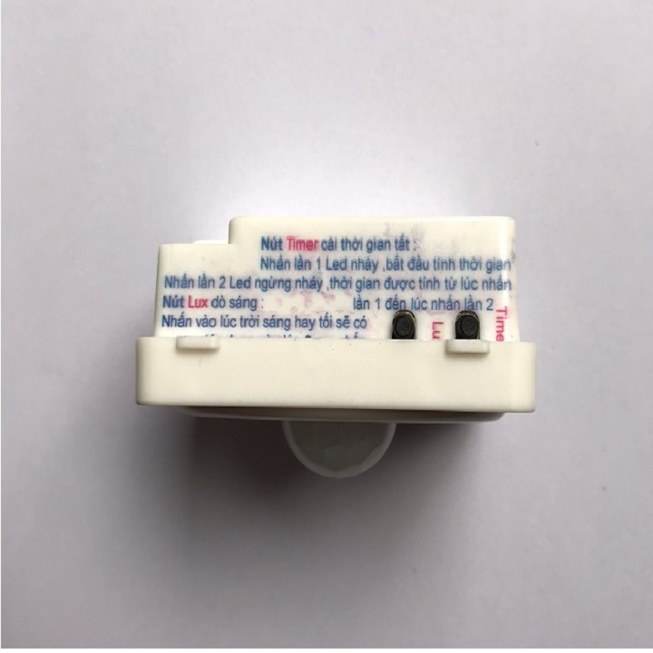 Hướng dẫn sử dụngNút chình thời gian( Thời gian tắt đèn khi không có người)1: Nhấn thả nút Timer => Led xanh nhấp nháy( Bắt đầu tính thời gian)2: Sau khoảng thời gian nhấn nhả nút Timer lần nữa => Led xanh ngừng sángNút chỉnh độ Lux làm việcNgười sử dụng muốn đèn cảm ứng làm việc lúc sáng, tối hoặc ánh sáng lờ mờ chỉ đơn giản nhấn nút Lux => Đèn xanh sẽ nháy, sẽ tuwh giò và ghi nhớ ánh sángTại thời điểm ánh sáng, bằng hoặc nhỏ hơn ánh sáng nhấn nút Lux, Đèn sẽ hoạt độngTại thời điểm ánh sáng. sáng hơn lúc nhấn nút Lux đèn sẽ ngừng hoạt động