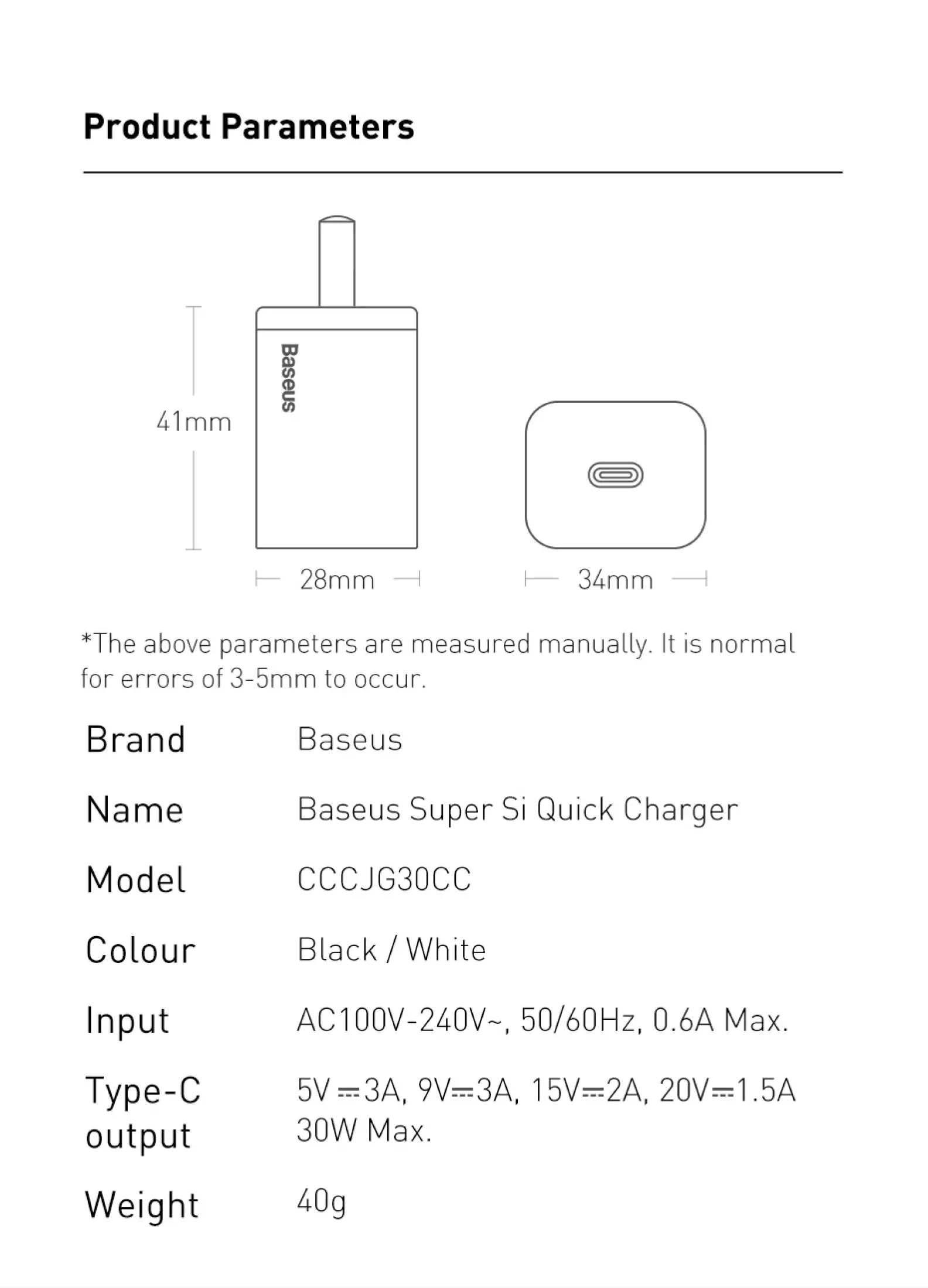 - Nhờ được trang bị công nghệ bán dẫn Super SI nên củ(cốc) sạc đa năng Baseus Super SI Quick Charger 30W có thể hỗ trợ đồng thời các chuẩn sạc nhanh Power delivery và Quick charge 3.0 với công suất lên đến 30W nhưng với một kích thước vô cùng nhỏ gọn.