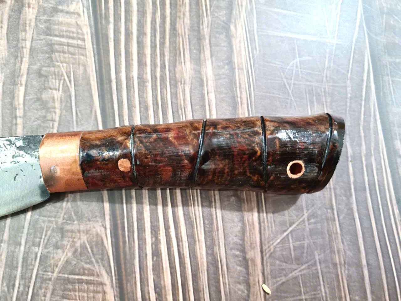 - Cán gỗ cẩm chỉ núi đá kết hợp với khâu đồng đỏ được chốt đinh tán và keo liên kết đảm bảo độ bền chắc.