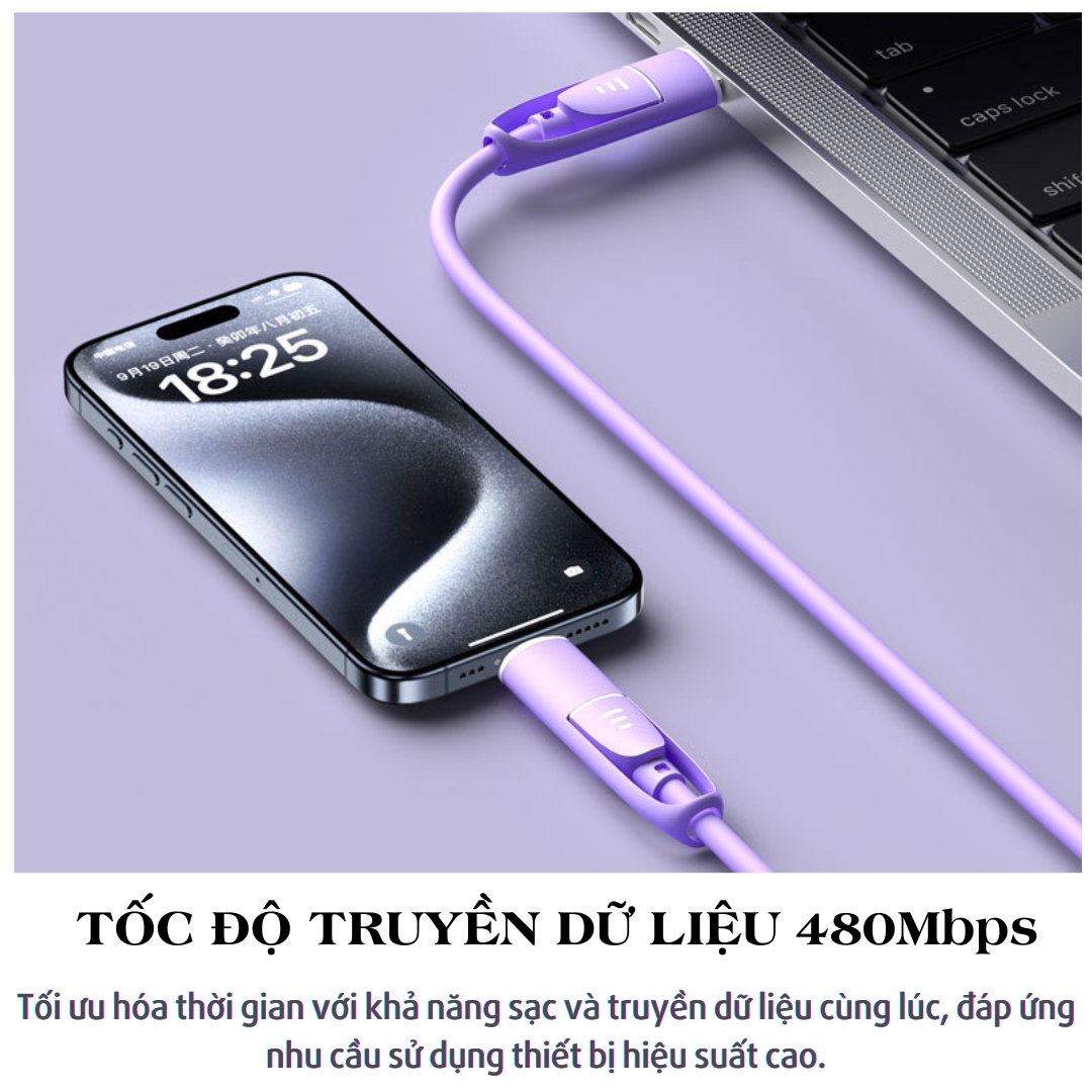 Dây sạc HOTCASE SiliFast hỗ trợ 4 đầu sạc tiện lợi: C to L, C to C, USB to C, và USB to L, với công suất sạc tối đa lên đến 65W. Với tốc độ truyền tải dữ liệu lên đến 480 Mbps, dây sạc này đáp ứng mọi nhu cầu của các thiết bị hiện đại, từ sạc đến truyền dữ liệu, giúp bạn tiết kiệm thời gian và nâng cao hiệu suất công việc.