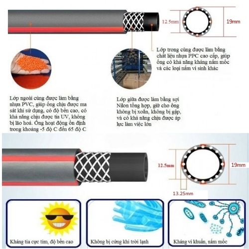 | Hướng dẫn sử dụng | - Ống tưới vườn 3 lớp được dùng để tưới rau, tưới cây trồng cho sân vườn của các hộ gia đình;- Dùng trong hệ thống tưới phục vụ trang trại nông nghiệp, nhà vườn;- Sử dụng tưới và rửa cây trong công viên, khu đô thị, tòa nhà, bệnh viện, nhà máy;- Được dùng để rửa xe máy, rửa xe ô tô, rửa tường, sàn nội - ngoại thất;- Làm ống dẫn xịt khô trong các máy nén khí, |