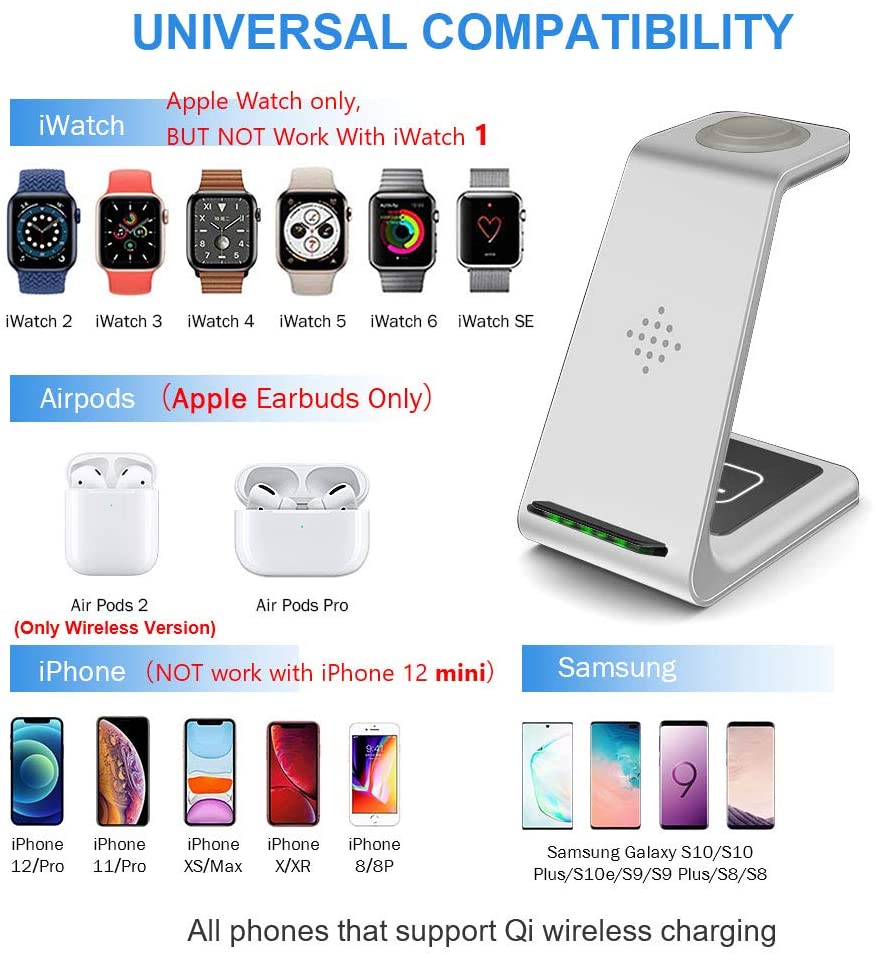 | Lưu ý | Tránh sử dụng ốp lưng dày (> 5mm). Không sạc bộ Sạc Không Dây từ máy tính hoặc các thiết bị khác. Đặt thiết bị hỗ trợ Qi của bạn ngay ngắn với từng khu vực Sạc Không Dây khi sạc. Cần có adapter Sạc nhanh 12V / 2A khi sạc đồng thời 3 thiết bị hoặc muốn có tác dụng Sạc nhanh và Để phát huy hết tác dụng của sạc |