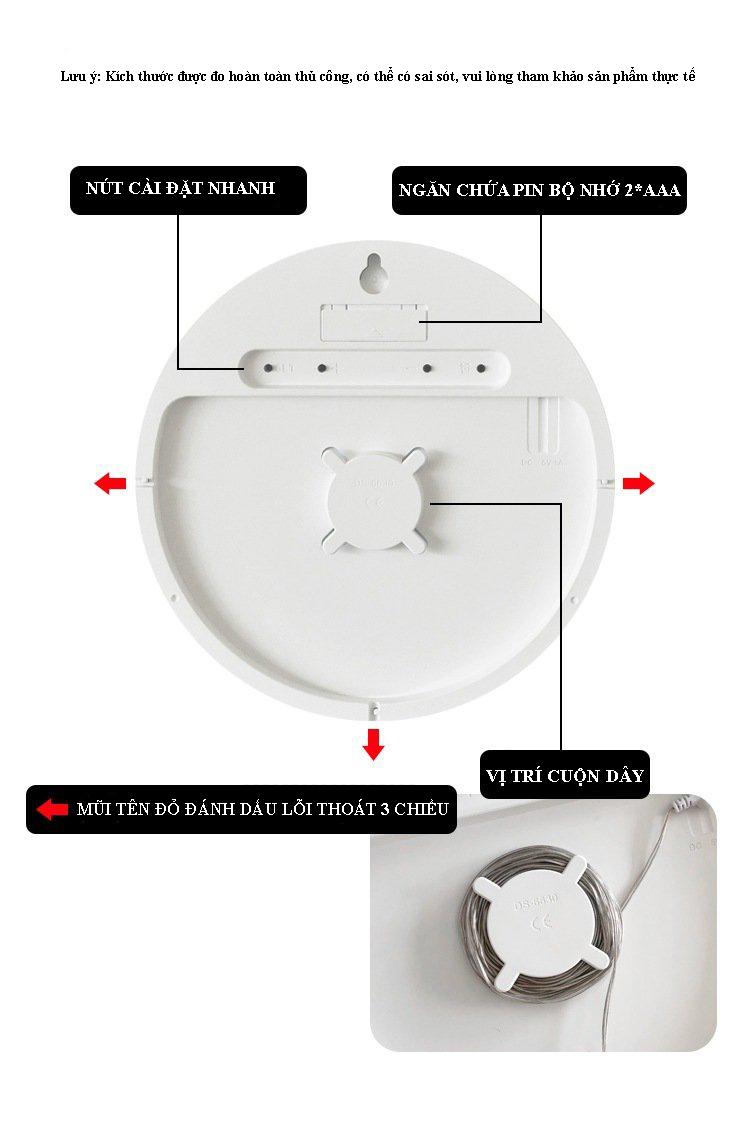 6. Chức năng bộ nhớ tắt nguồn: Cần có 2 pin AAA cho chức năng bộ nhớ tắt nguồn mà chúng tôi KHÔNG cung cấp. Chức năng bộ nhớ có nghĩa là nó có thể lưu trữ cài đặt báo thức/độ sáng/thời gian và không cần cài đặt lại sau khi kết nối lại với nguồn điện. (Lưu ý: Pin chỉ dùng cho chức năng ghi nhớ không phải là nguồn điện. Đồng hồ chỉ hoạt động khi cắm nguồn.)