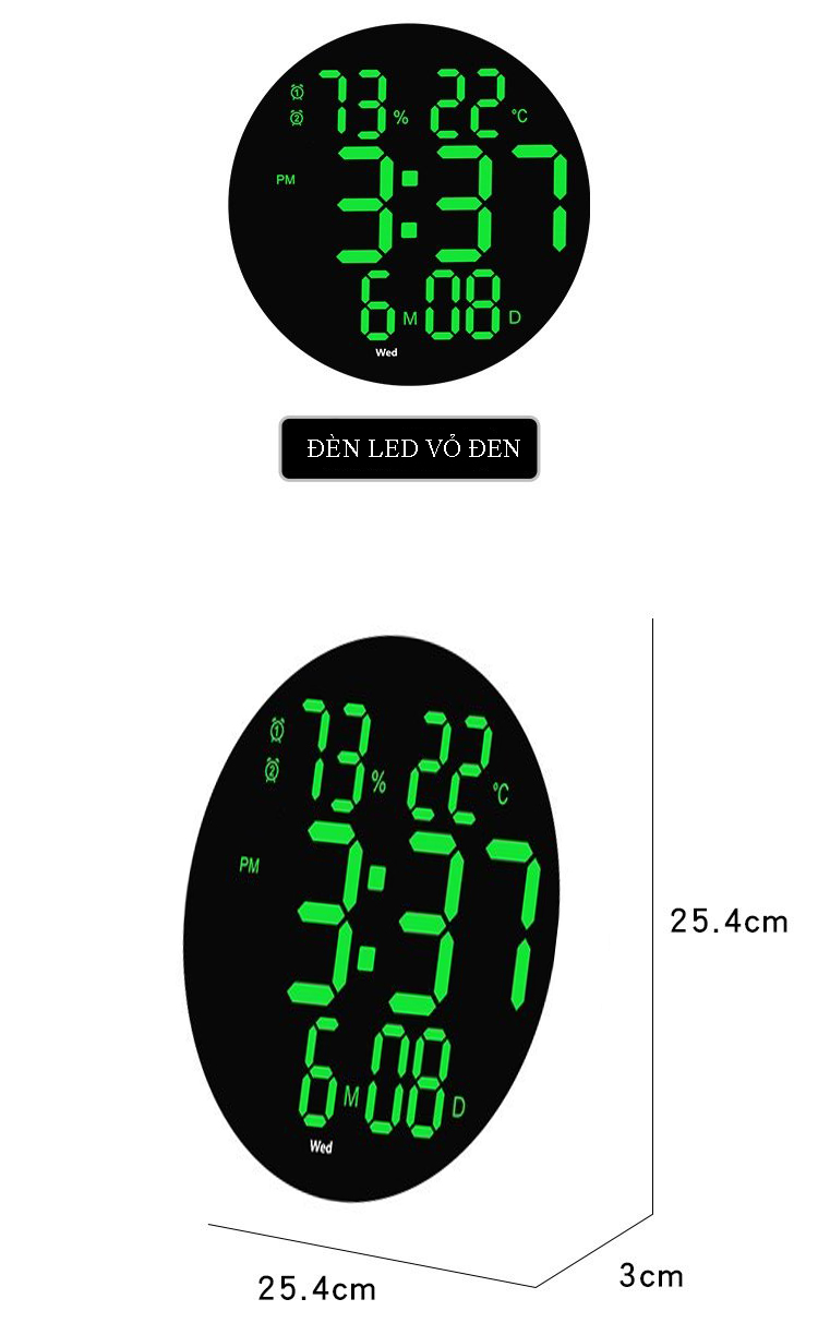 - Hiển thị Giờ : Phút số lớn, Ngày Tháng, Nhiệt độ, Độ ẩm Thứ lịch