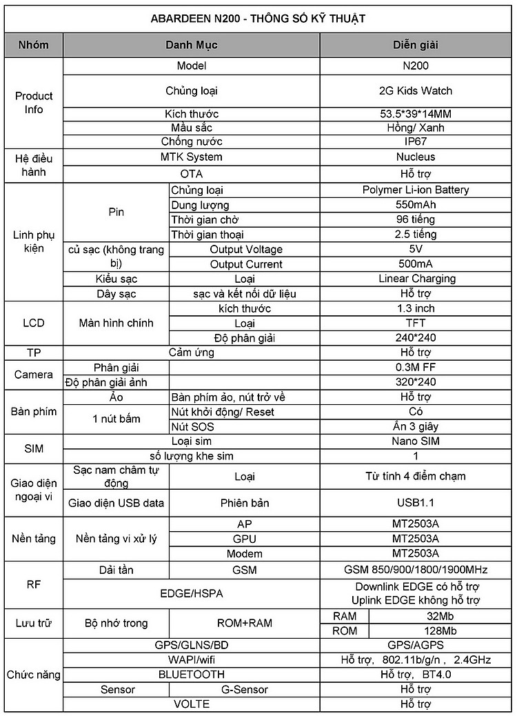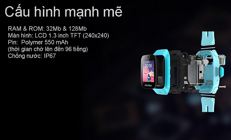 Cấu hình mạnh: Đồng hồ abardeen N200 (chống nước IP67) còn được trạng bị Cấu hình phần cứng mạnh mẽ với: RAM và ROM lần lượt là 32Mb & 128Mb giúp hiệu năng hoạt động của đồng hồ được nâng cao hơn nhiều. Dung lượng Pin (li -poliment) lên đến 550 mAh giúp cho đồng hồ có hiệu suất hoạt động tốt hơn nhiều với thời gian chờ lên đến 96 tiếng! Quá là KHỦNG KHIẾP!!!