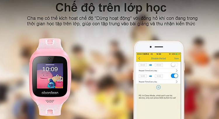 Chế độ trên lớp học (Chế độ không làm phiền) là một tính năng thông minh nữa của Đồng hồ định vị abardeen N200 (chống nước IP67), tính năng này cho phép cha mẹ vô hiệu hóa việc sử dụng đồng hồ khi con đang trong giờ học bài trên lớp, giúp trẻ tập trung vài việc nghe giảng và học tập