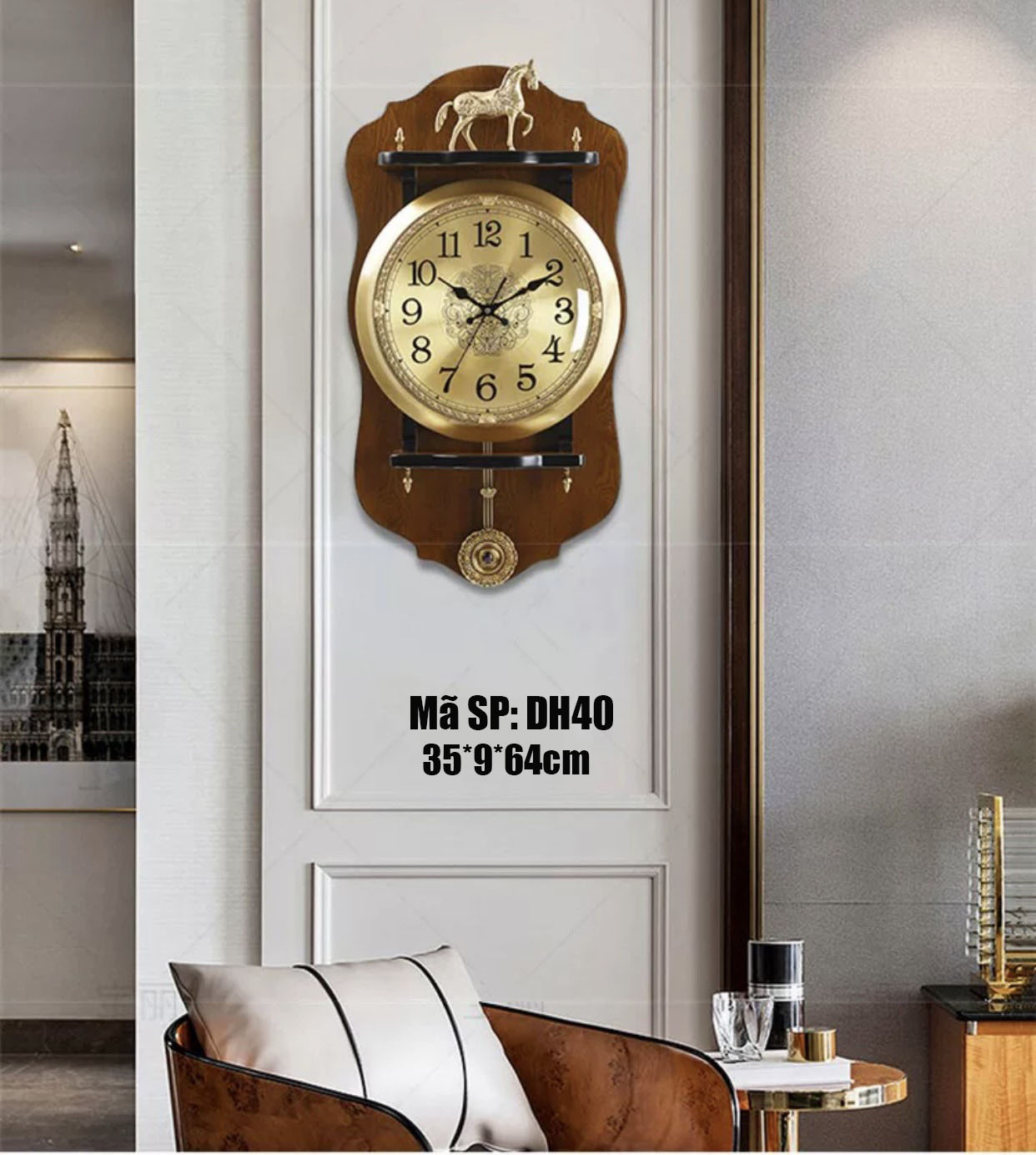 Đồng hồ treo tường DH40 được làm từ gỗ sồi và hợp kim phủ đồng chống han gỉ, tạo nét cổ điển. Máy chạy pin tiểu thông thường, quả lắc có dao động qua lại liên tục và kim giây trôi êm ái sang trọng, không còn tiếng tích tắc.