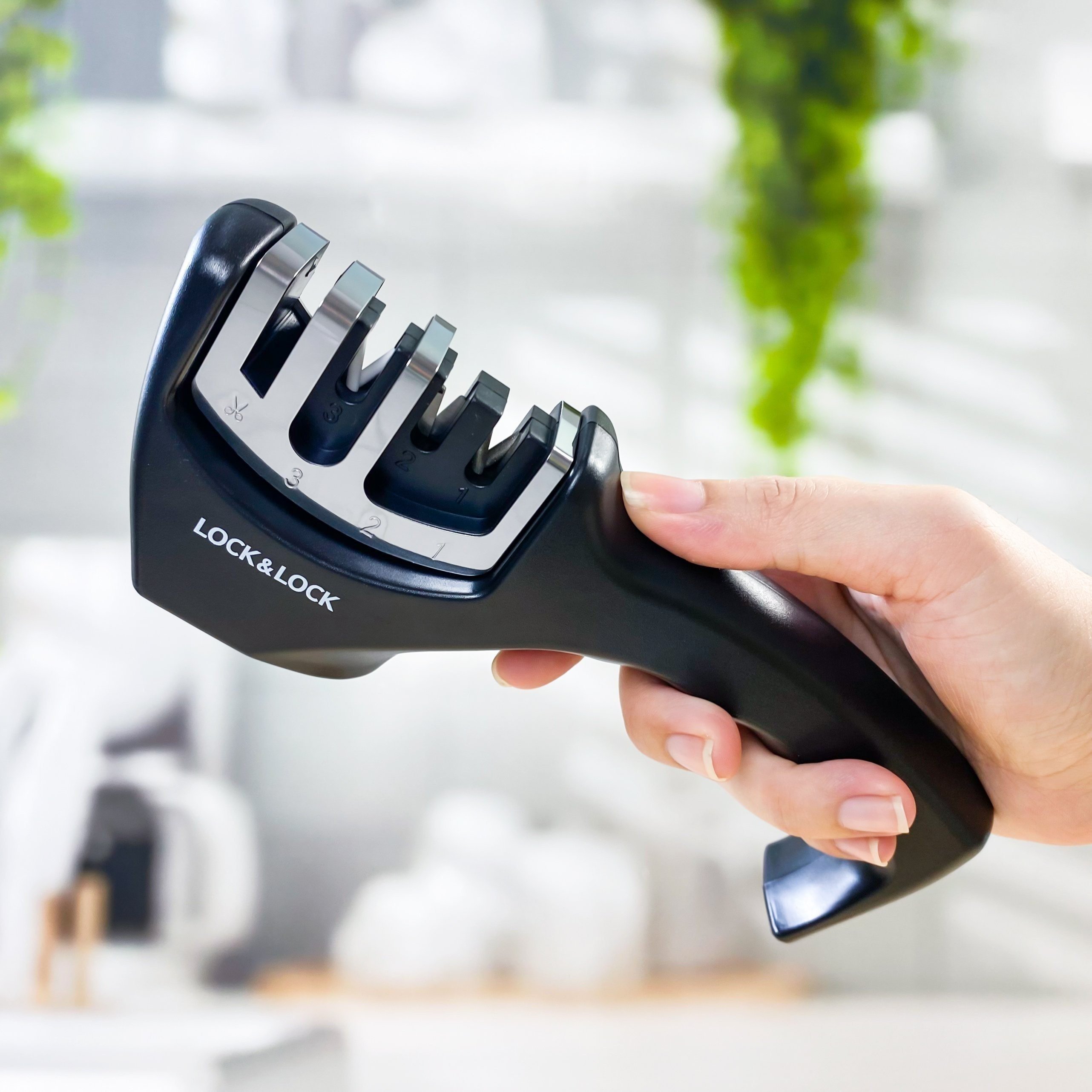 | Hướng dẫn sử dụng | Đặt dụng cụ mài dao trên bề mặt bằng phẳng. Giữ dụng cụ bằng một tay và cán dao bằng tay kia.Đặt toàn bộ lưỡi dao vào rãnh tạo thành một góc 90 độ với lưỡi mài, ép một lực nhẹ xuống khi kéo lưỡi dao qua khe khi mài từ phẩn cuối mũi dao đến mũi dao. Lặp đi lập lại 5-7 lần sẽ giúp lưỡi dao sắt bén, nhưng nếu lưỡi dao làm bằng thép cực cứng thì nên dùng lực mạnh tay.Dụng cụ có 3 rãnh từ 1 đến 3. không được mài luân phiên trong ba rãnh. Có 1 rãnh mài kéo, khi mài đặt kéo vào rãnh mài kéo di chuyển từ đầu đến tay cầm và lập đi lập lại. |