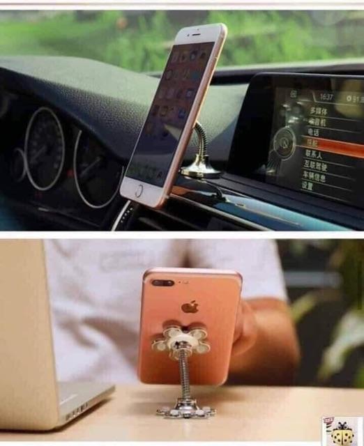 – Giá đỡ điện thoại để trên ô tô, bàn…, dưới đế là miếng dán + hút chân không, bên trên là hút chân không siêu chắc không bị rơi điện thoại, có thể vặn xoay theo ý muốn