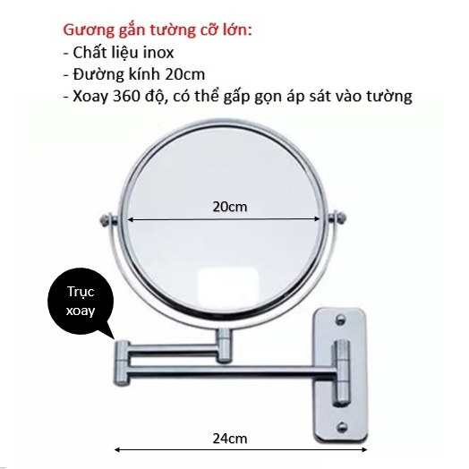 Vị trí/ nơi lắp Gương trang điểm cỡ lớn, 2 mặt phóng đại xoay 360 độ, treo tường phòng tắm, phòng ngủ, khách sạn Inox304: