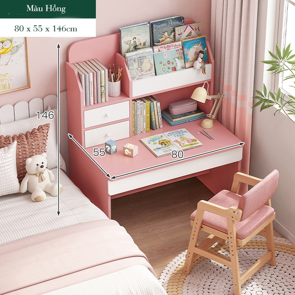 - Kích thước bàn học được tính toán và thiết kế theo tiêu chuẩn nhất định, phù hợp với chiều cao của bé, giúp bé thoải mái ngồi học mà không cần phải khom lưng, cúi người,.. Tránh các bệnh về mắt và cột sống.