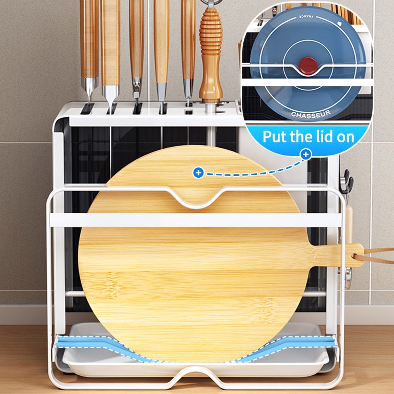 - Bộ đầy đủ như hình gồm: Khay để dao, thớt, đũa, khay hứng nước, móc treo (4 cái). Giỏ đũa và khay hứng nước tháo rời được để vệ sinh.