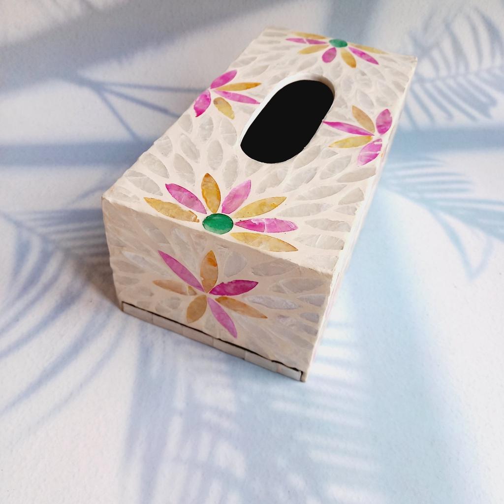 Hộp đựng giấy ăn được làm thủ công từ làng nghề thủ công mỹ nghệ truyền thống. Hộp có kích thước 23x11x8cm. Hộp được làm từ cốt gỗ và sơn mài khảm trai, hoạ tiết bông hoa. Hộp đựng giấy ăn dùng trong gia đình, nhà hàng, khách sạn hoặc làm quà tặng khách trong những dịp đặc biệt.