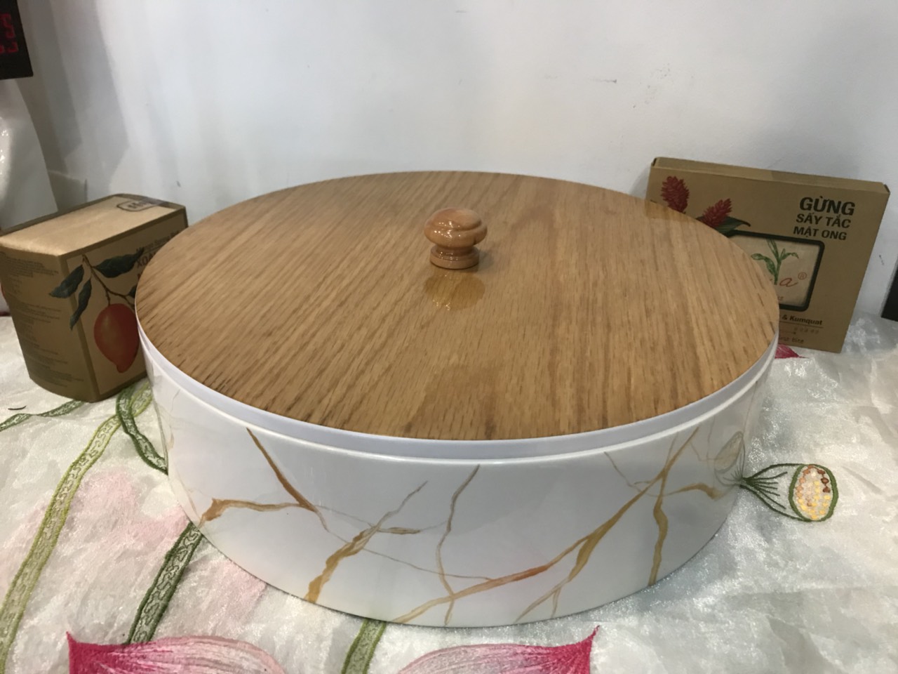- Hộp mứt sơn mài tròn 4 ngăn tiện dụng, ứng dụng cao sau tết.