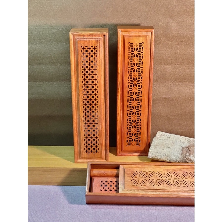 - Mô tả: Hộp làm từ gỗ hương, nắp trượt khắc hoa văn, đế có tấm vải chống cháy giúp đốt nhang không tăm
