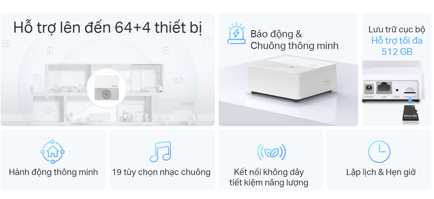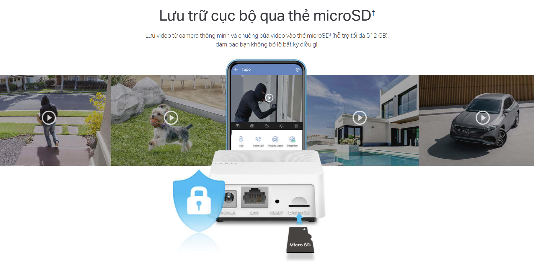 Lưu trữ cục bộ qua thẻ microSD - Lưu video ghi lại từ camera hoặc chuông cửa video vào thẻ microSD gắn trong hub (hỗ trợ tối đa 512 GB)†.