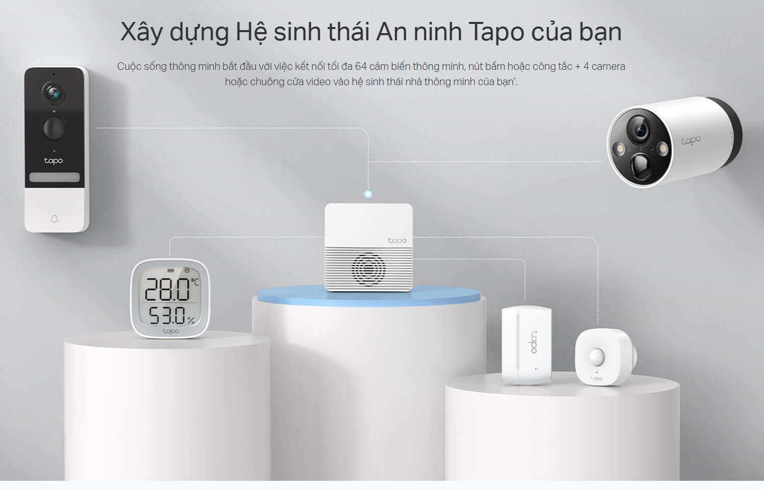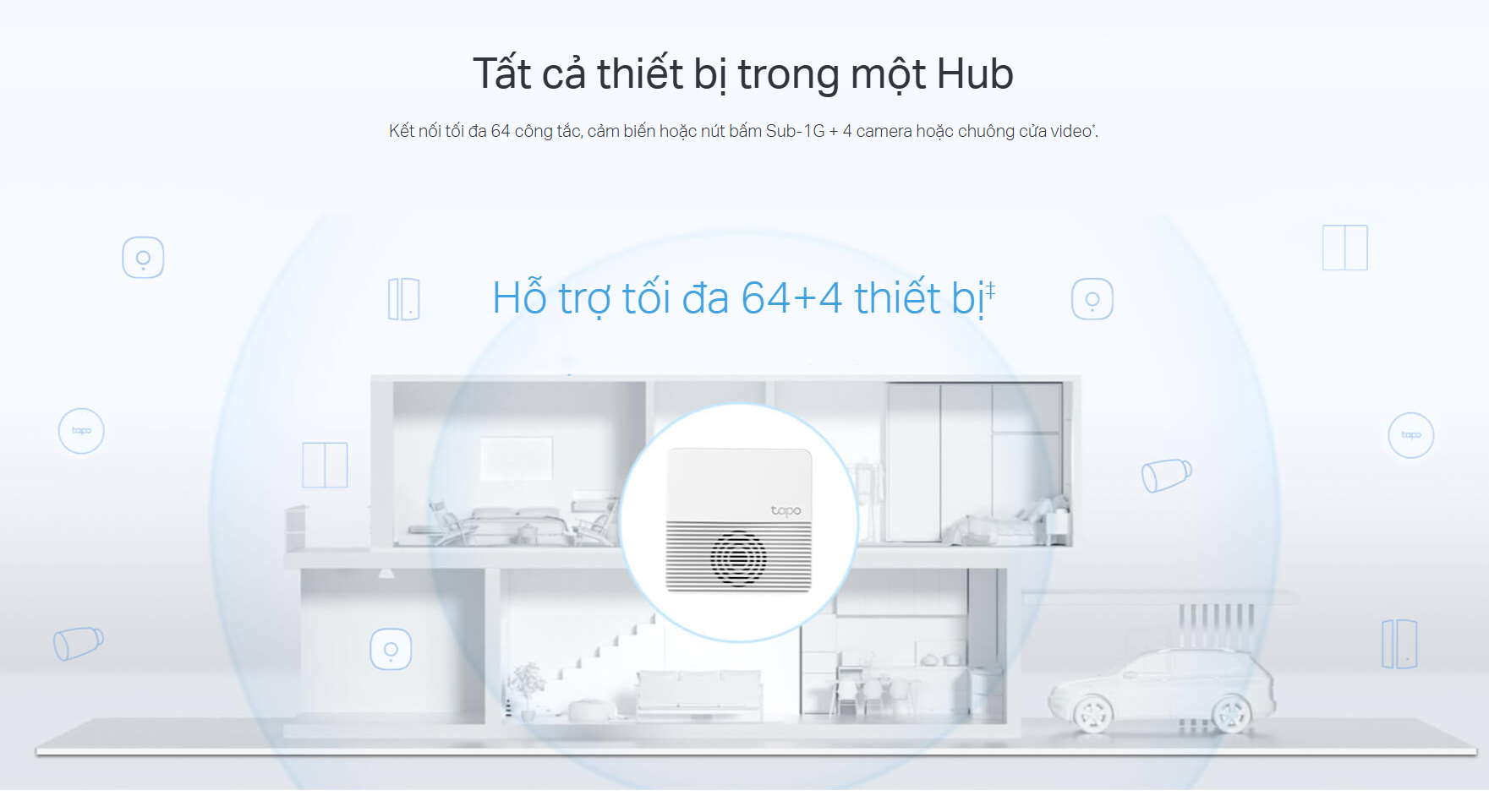 Hỗ trợ tới 64+4 thiết bị - Kết nối nhiều thiết bị hơn (tối đa 64 công tắc*, cảm biến hoặc nút nhấn + 4 camera hoặc chuông cửa) để tạo hệ sinh thái nhà thông minh. Tương thích với Tapo C420, Tapo C400, Tapo D230 và nhiều sản phẩm khác.