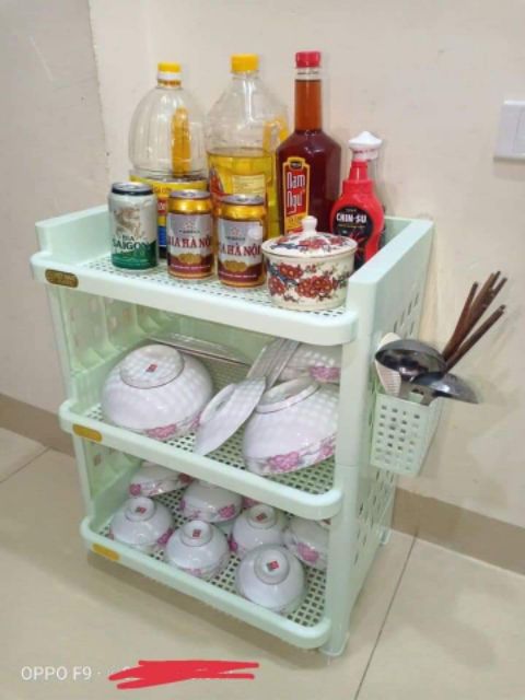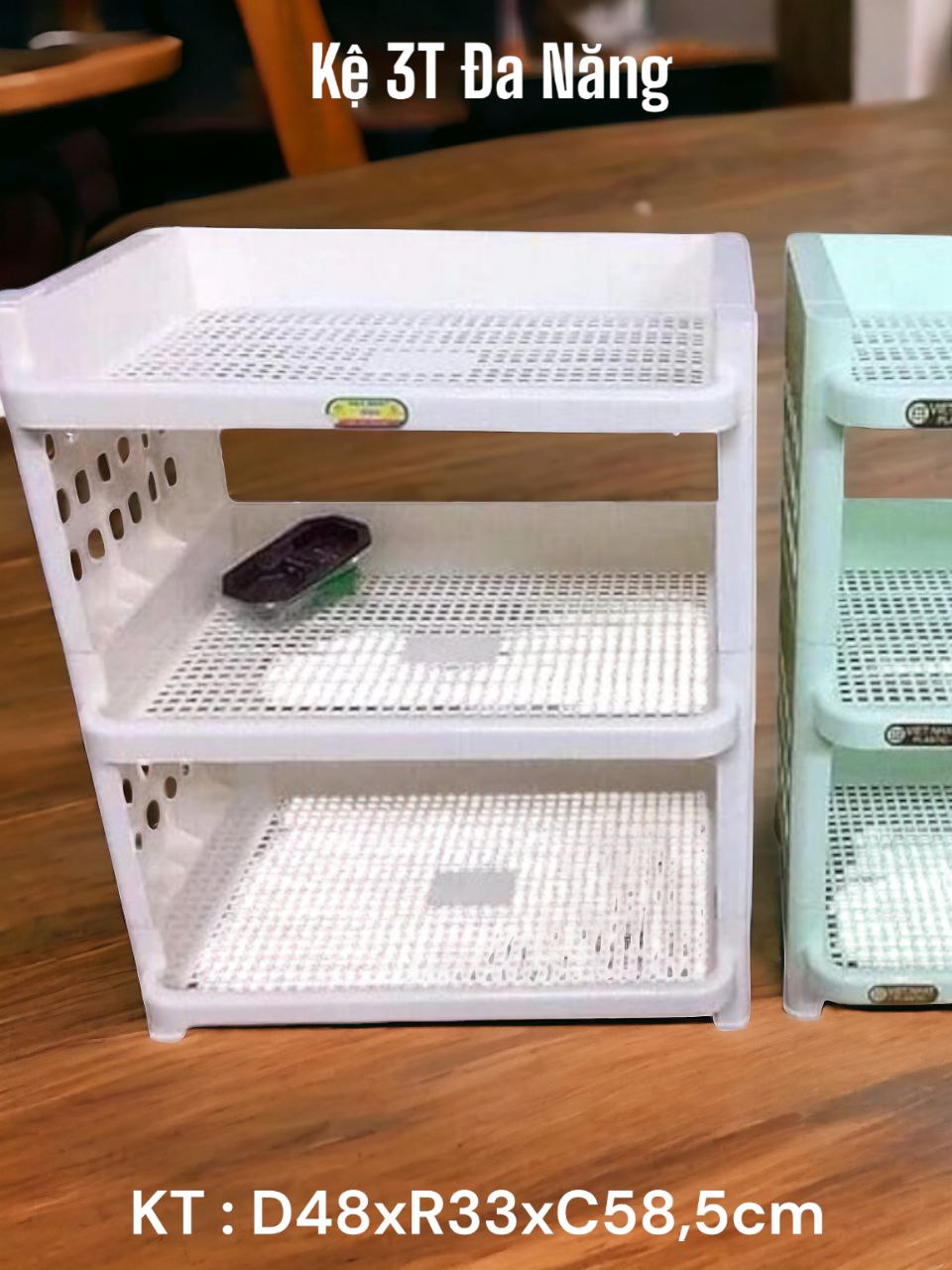 - Kệ gồm có 2 tầng, 3 tầng thiết kế rộng rãi dùng để đựng vật dụng cá nhân và gia đình vô cùng hiệu quả. đặc biệt với không gian nhà tăm, nhà bếp. Luôn tạo cảm giác gọn gàng sạch sẽ