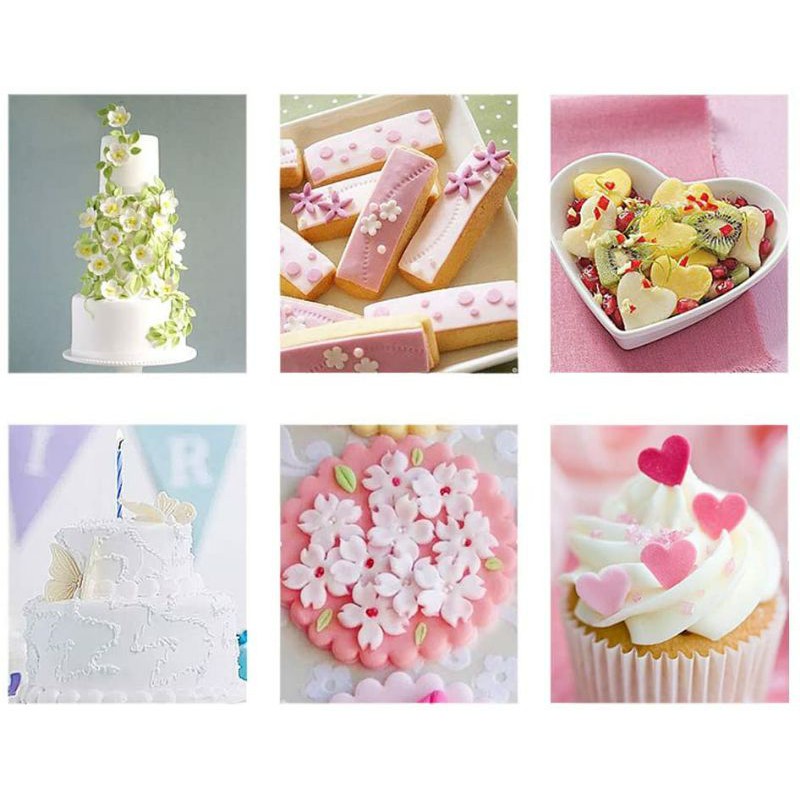 Bộ sản phẩm gồm 11 dụng cụ là 57 khuôn nhấn giúp tạo hình fondant trang trí bánh một cách đơn giản, nhanh chóng.