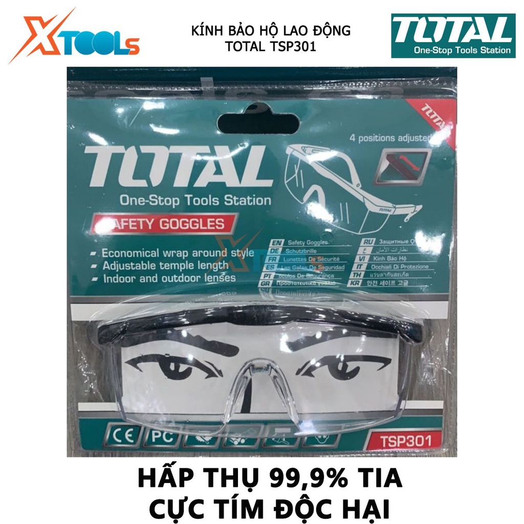 - Sản phẩm có khả năng chống lại tia cực tím đến 99.9% và ngăn cho mắt không tiếp xúc với nước và chống tích tụ hơi sương. Kính bảo hộ Total TSP301 là một sản phẩm giúp bảo vệ đôi mắt của người dùng, không cho các vật lạ bay vào như trong quá trình thực hiện việc sửa chữa, vận hành các máy móc hay thường xuyên cắt mài các vật liệu kim loại bắn ra những mảnh, tia sáng.