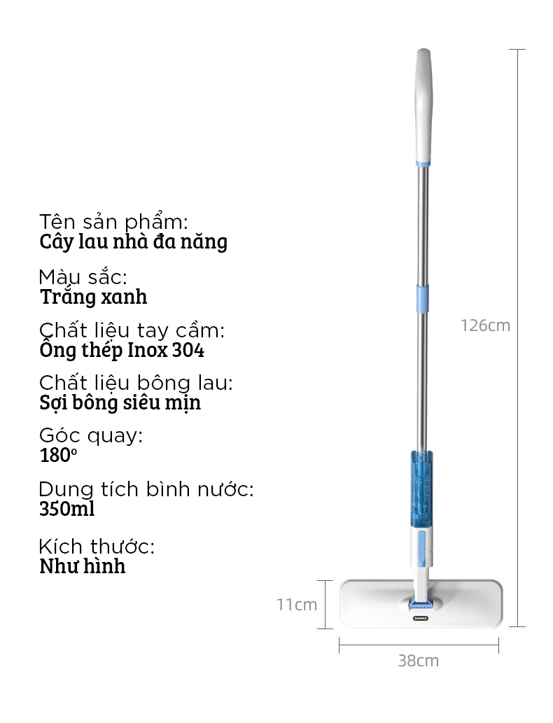 | Hướng dẫn sử dụng | - Bước 1: Lắp ráp các thanh tay cầm của cây lại với nhau- Bước 2: Cho nước lau nhà vào hộp đựng nước phun sương- Bước 3: Bấm nút để phun sương và lau kính- Bước 4: Tháo và lắp bản lau nhà để dọn dẹp ngôi nhà của bạn- Bước 5: Sau khi sử dụng cất gọn cây lau nhà và để miếng lau khô thoáng để đảm bảo vệ sinh và giữ được độ bền cho sản phẩm.(*) Lưu ý: Bạn có thể tham khảo kỹ hơn ở video mô tả sản phẩm hoặc liên hệ UniMart để được hướng dẫn và hỗ trợ một cách tốt nhất. |