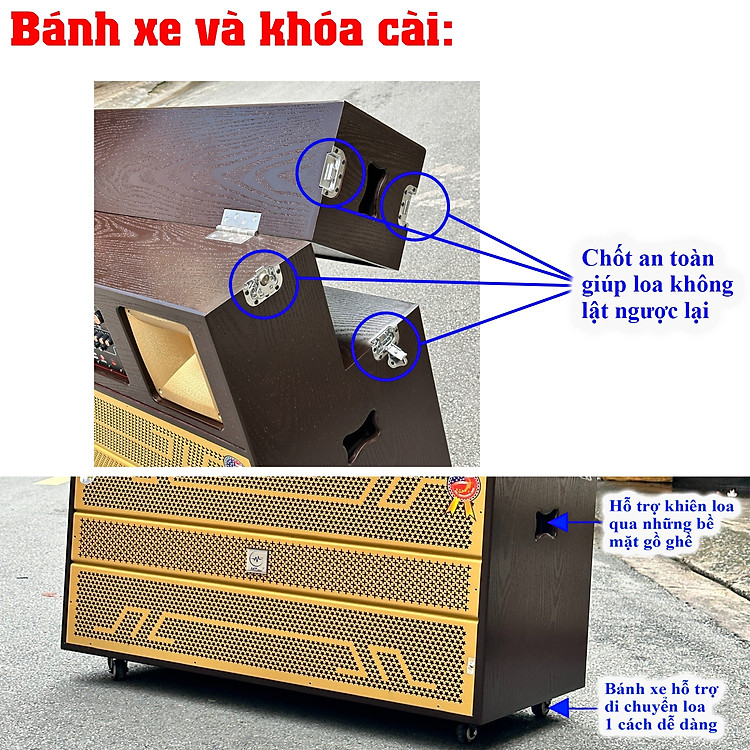 mang trong mình thiết kế đặc biệt, cho phép bạn dễ dàng gập lên hoặc hạ xuống một cách nhanh chóng và tiện lợi. Với tính di động cao, bạn có thể dễ dàng di chuyển loa từ một không gian này sang không gian khác nhờ vào 4 bánh xe hỗ trợ trên sản phẩm. Không chỉ dừng lại ở đó, màu sắc nâu đen và vân gỗ rõ ràng mang đến vẻ ngoài sang trọng, thời thượng cho